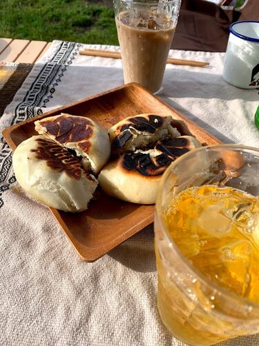 最終日です。 見上げる空には青空が! 乾燥撤収を半ばあきらめていたのですが、これならいけるかもと急ぎ朝食をすませ、撤収を始めます。特にTCのタープは乾燥させるために必死に朝露を払いました。 急いていたのか朝飯の肉まんは焦がしてしまいました(汗)…